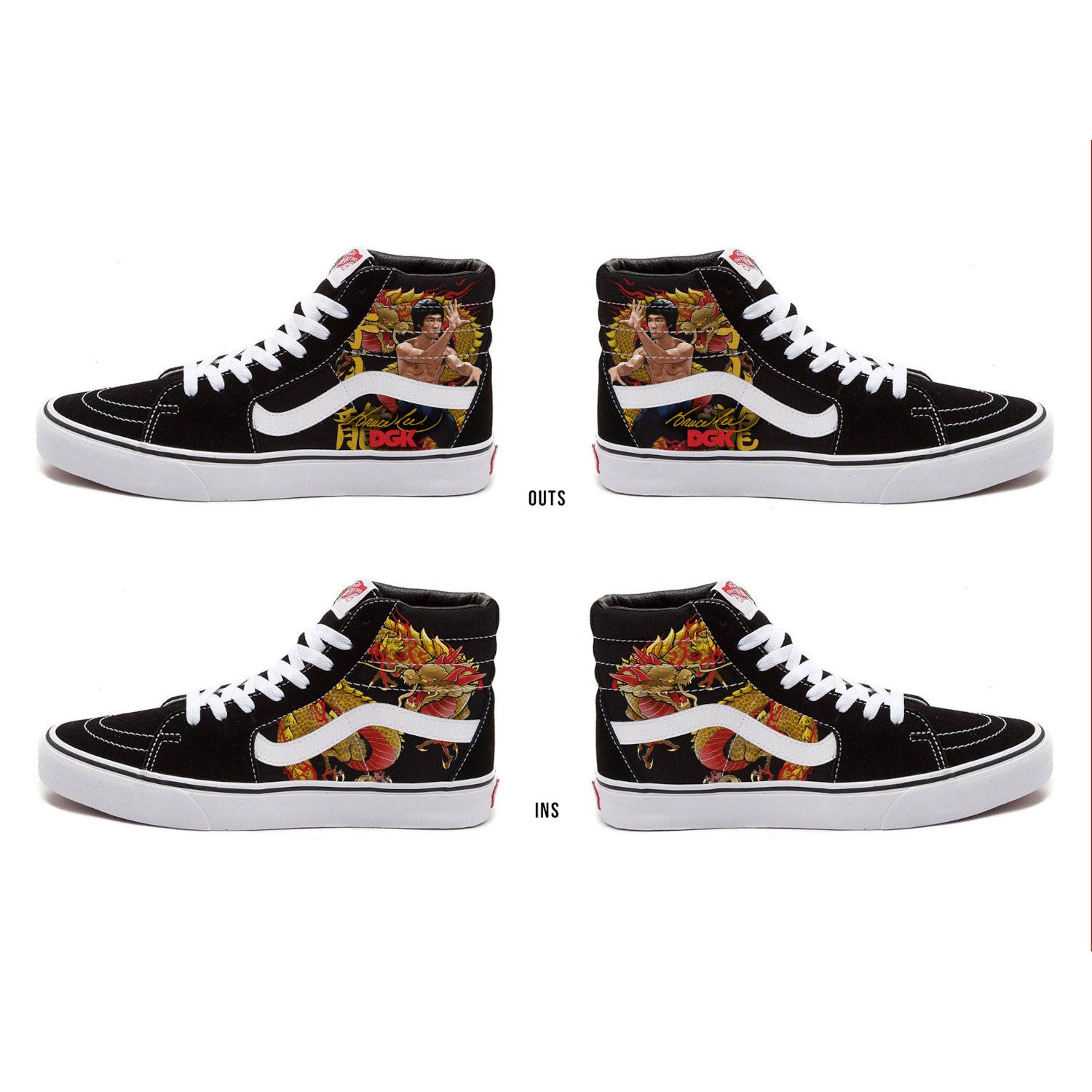 The Bruce Lee Breakthrough Vans Sk8 - Hi, a legendary lace-up high top inspired by the classic Old Skool, has a durable canvas and suede upper, a supportive and padded ankle, and Vans vulcanized signature Waffle Outsole. These shoes are exclusive to the Bruce Lee Family Store and made specifically for our community!